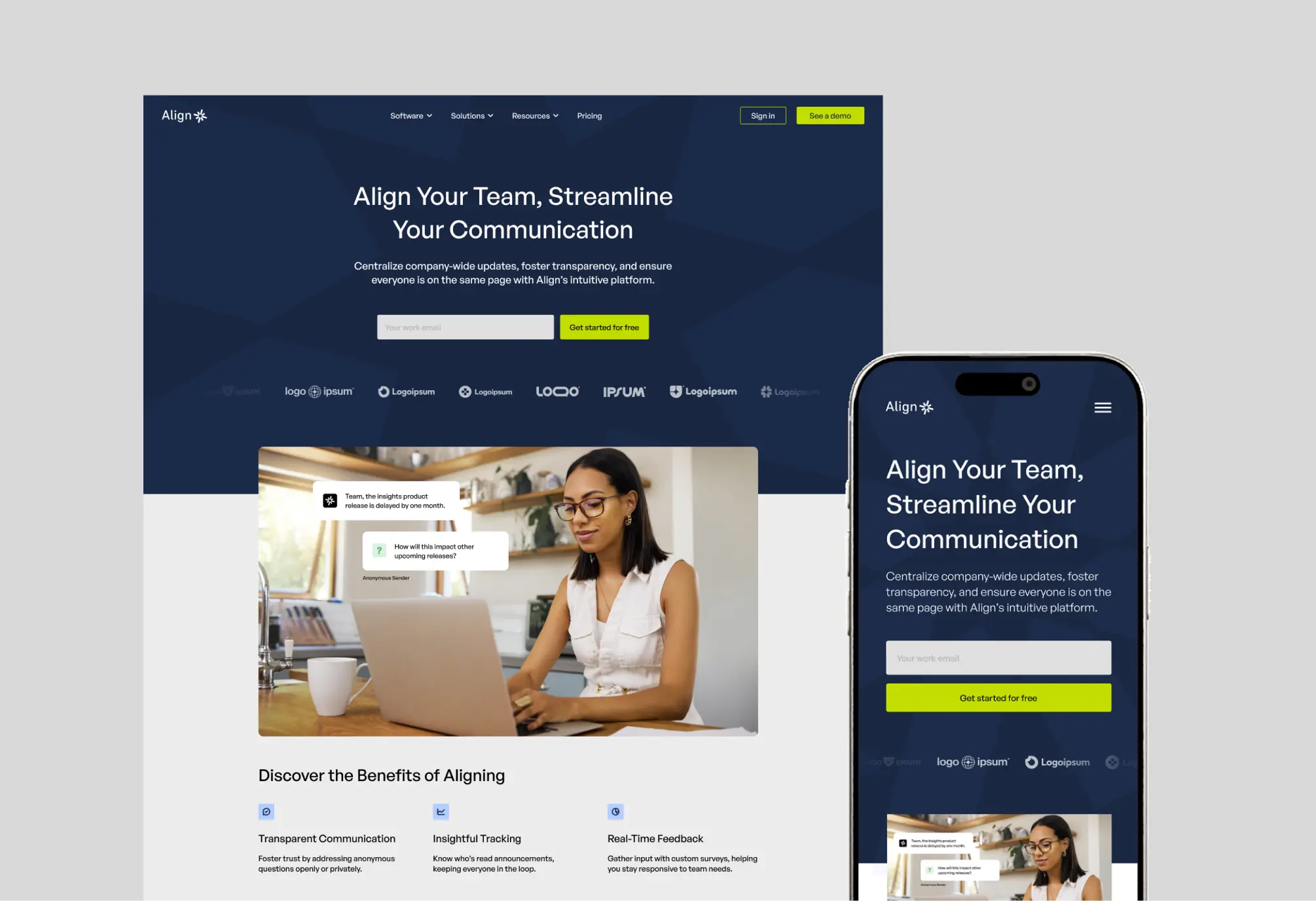 Align’s branding combines professionalism with approachability, emphasizing accessible, company-wide information. The logo and brand elements symbolize alignment, guiding teams toward a unified source.