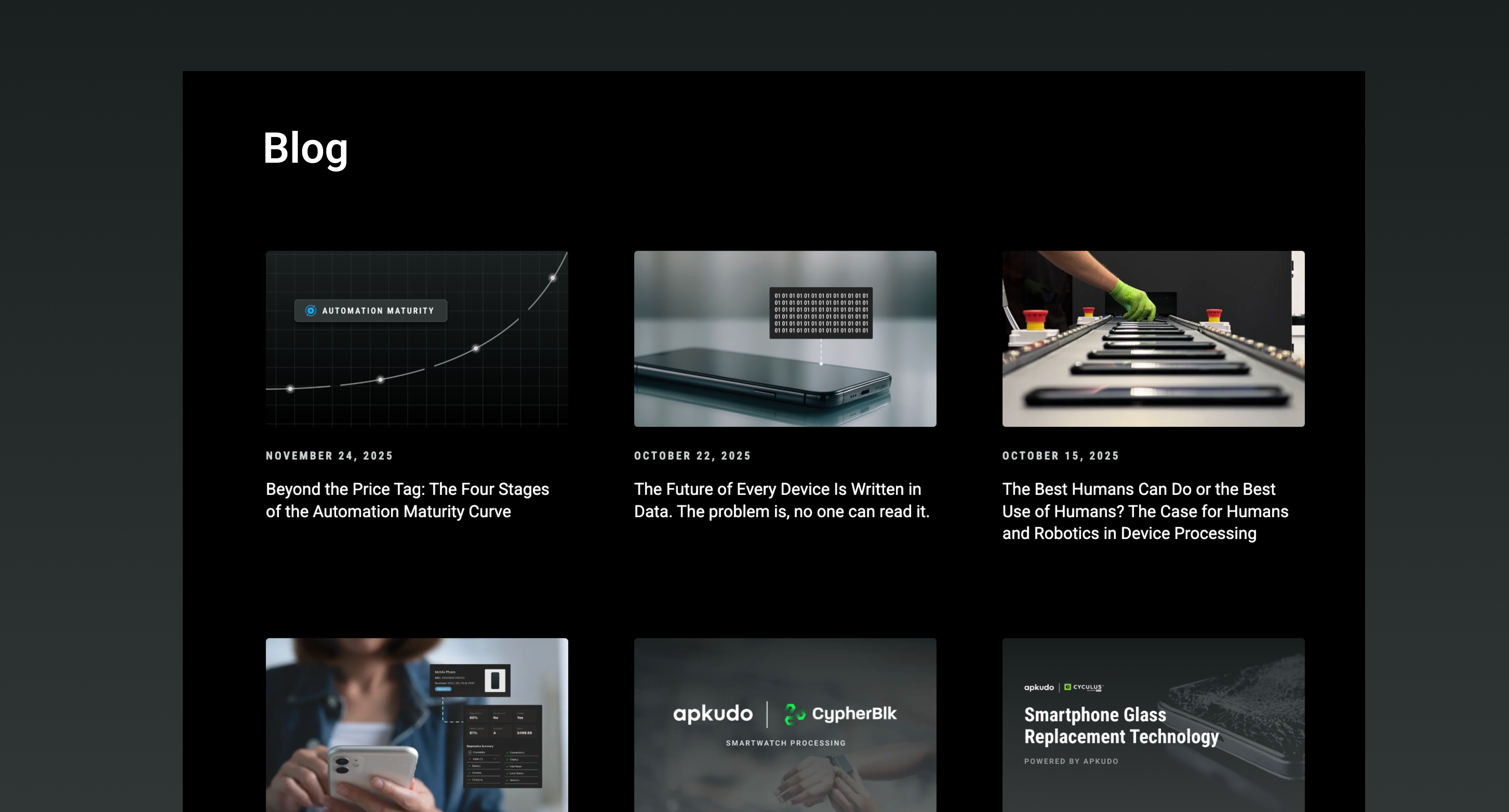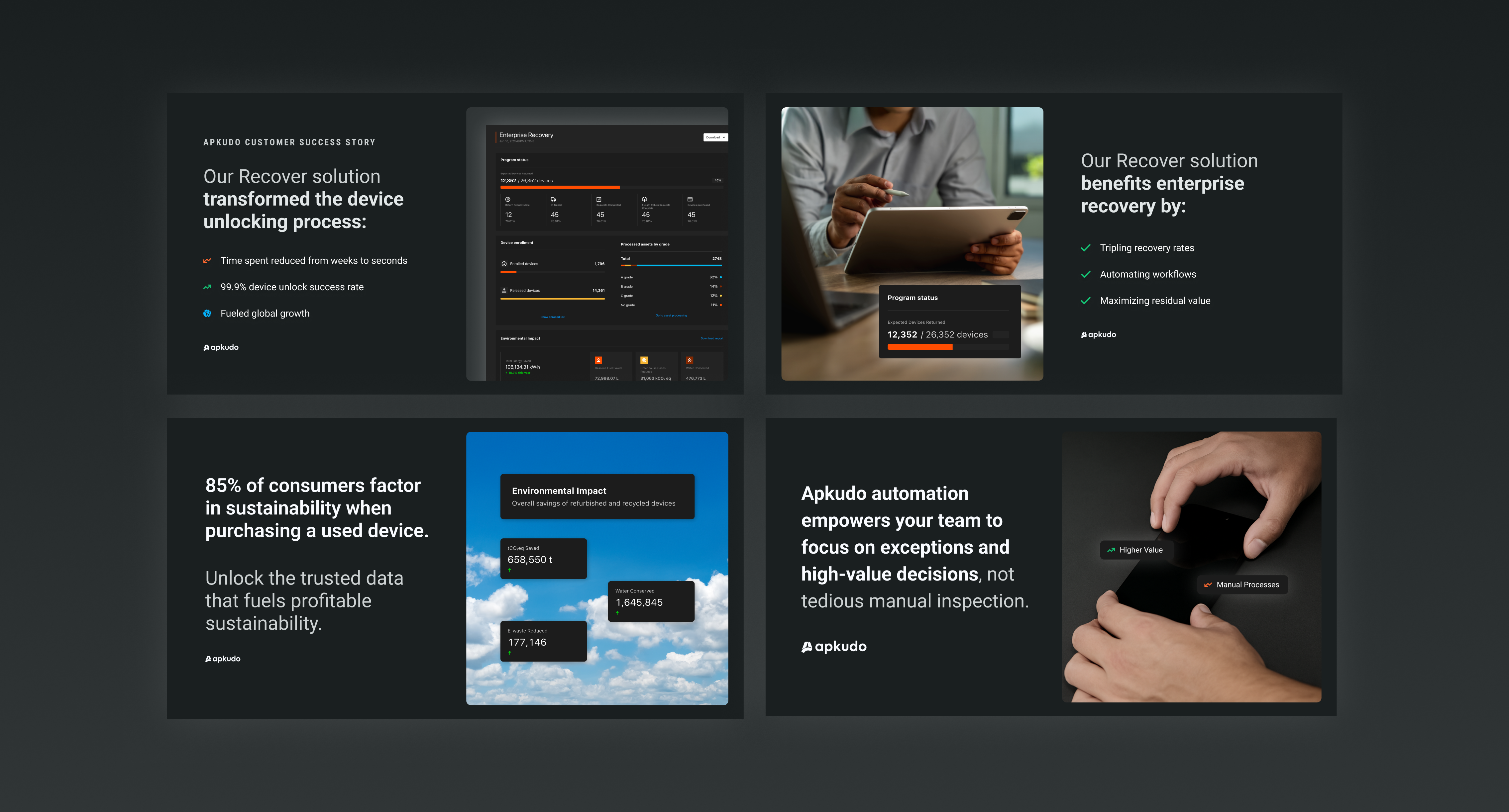 The visual system communicates clarity, confidence, and simplicity. A greyscale palette with intentional color accents (Apkudo blue for icons, underlines, and highlights) positions the brand as high-tech and modern. Minimal design ensures product images take center stage, while subtle gradients add depth and dimension. Photography of devices, people, and environments contextualizes Apkudo’s solutions in real-world scenarios.